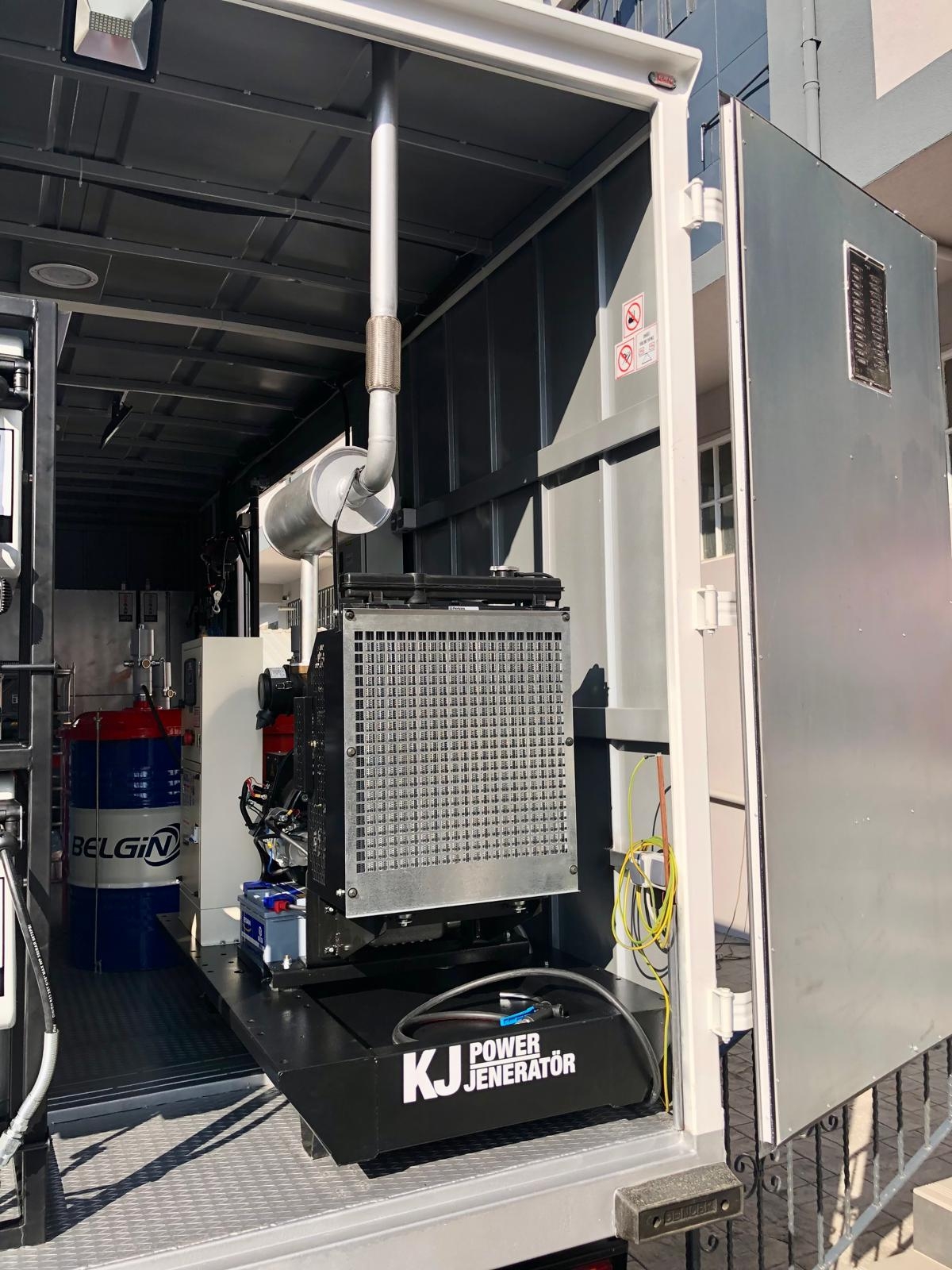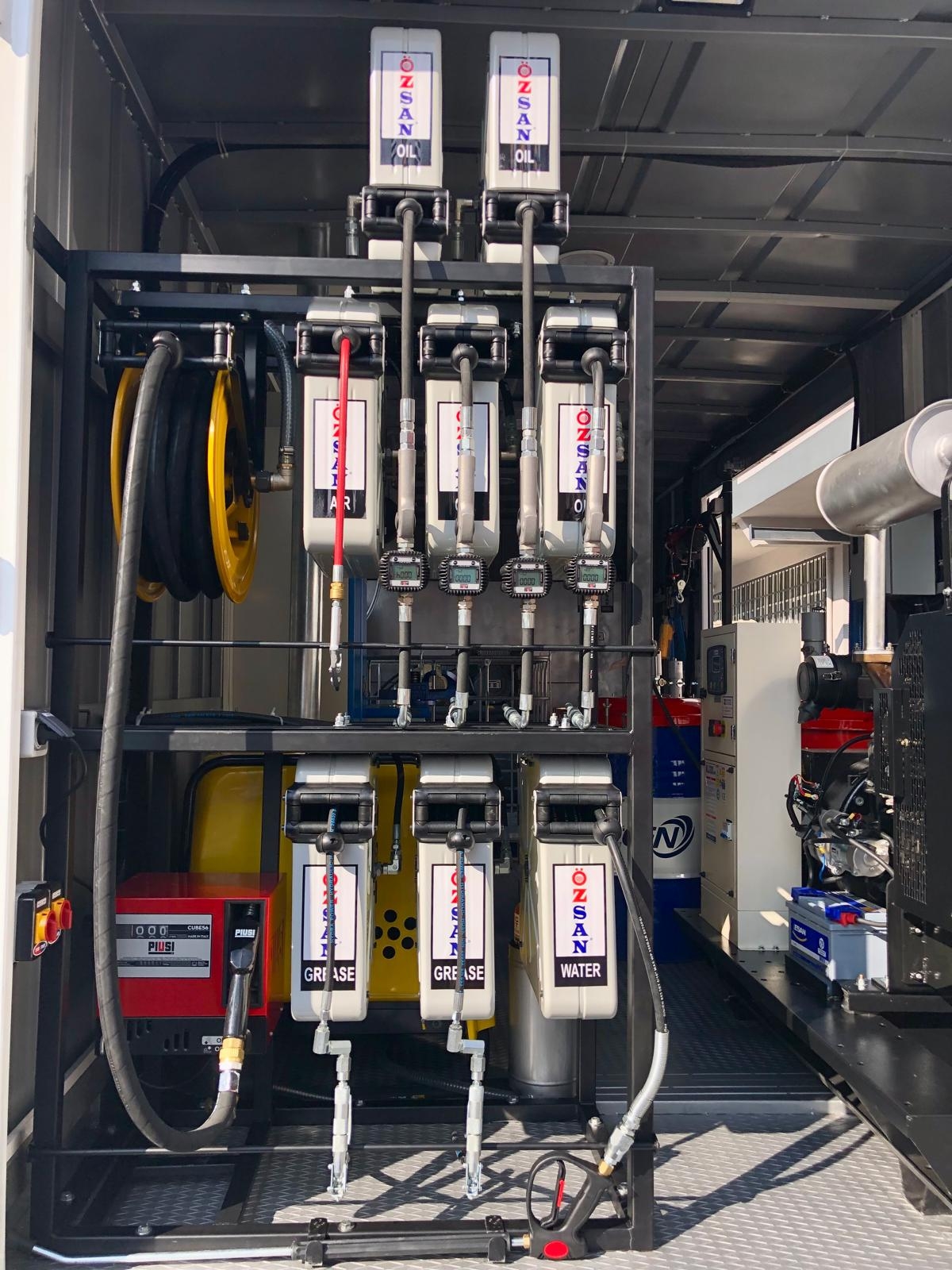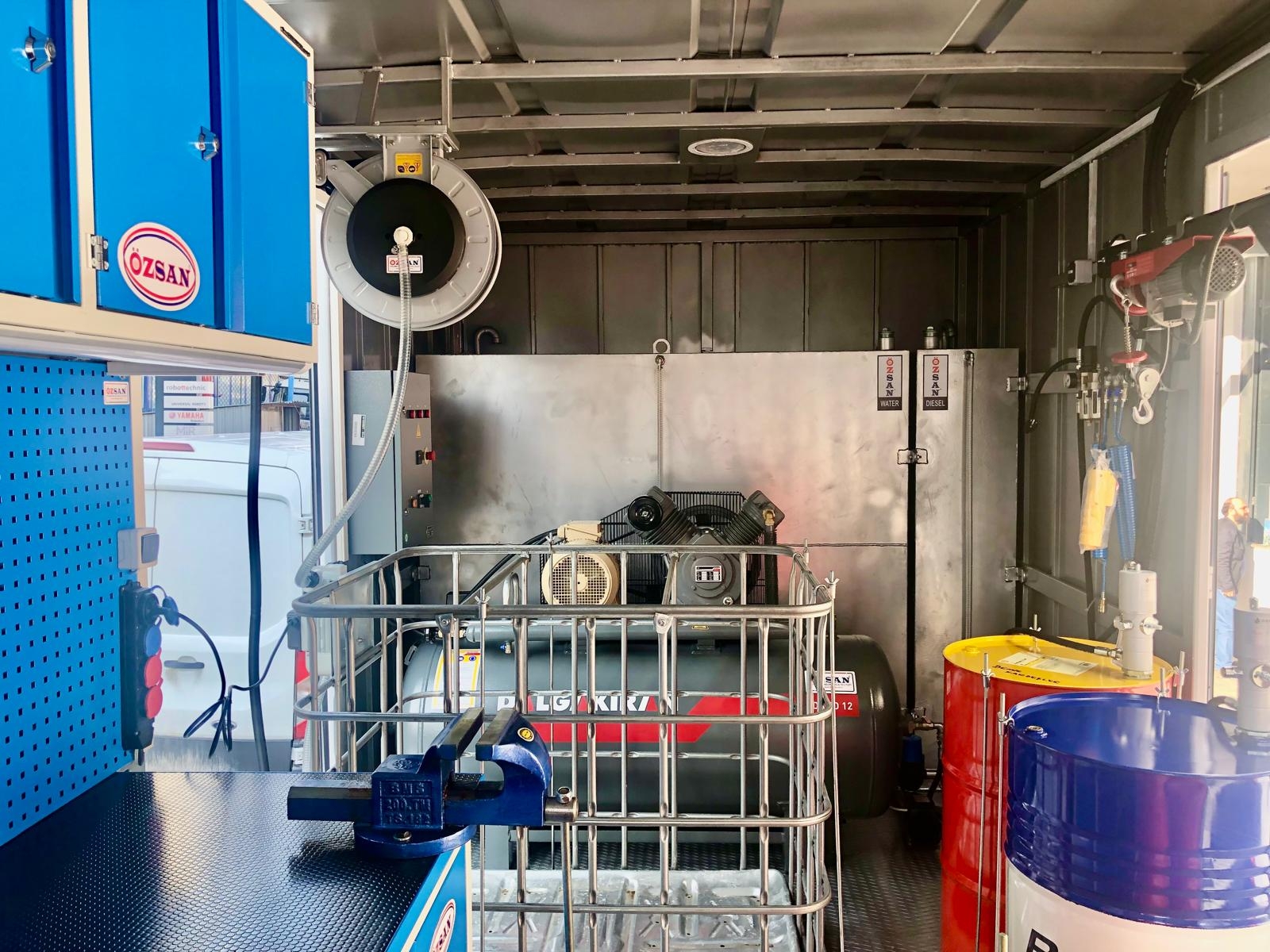 Kısaca içerisindeki ekipmanlar şöyledir; Jeneratör, Kompresör, Yıkama Makinası, Kaynak Makinası, Oksijen Asetilen Tüp Dolabı, Atık Yağ Sistemi, İnce Yağ Sistemi, Gres Sitemi, Hava Sistemi, Su Makarası, Mazot Tankı ve Pompası, Su Tankı, Çalışma Masası, Takım Dolabı, Mengene, Pano, Elektrik Tesisatı, İç ve Dış Aydınlatma vb. dir.