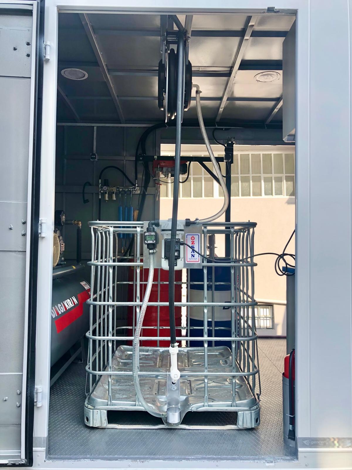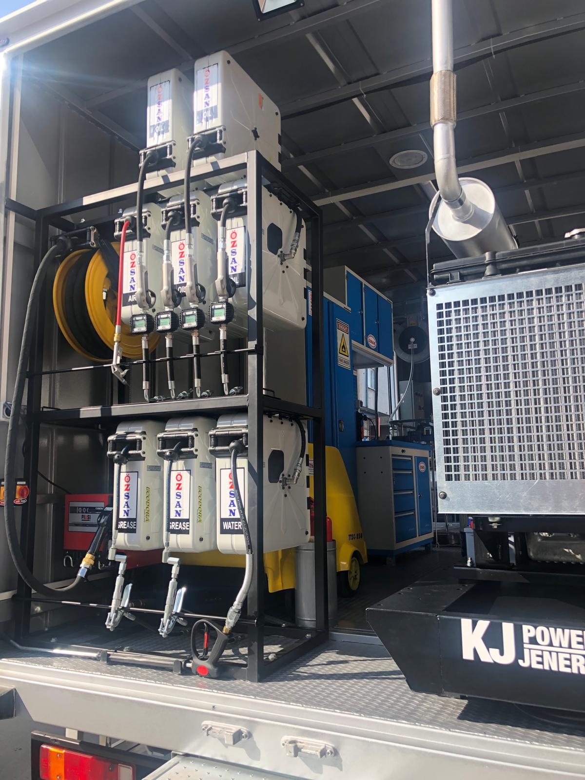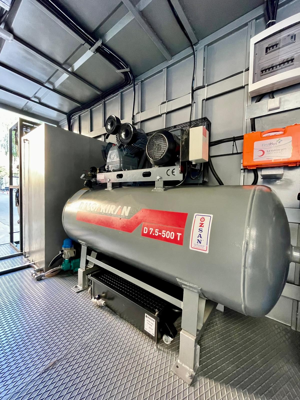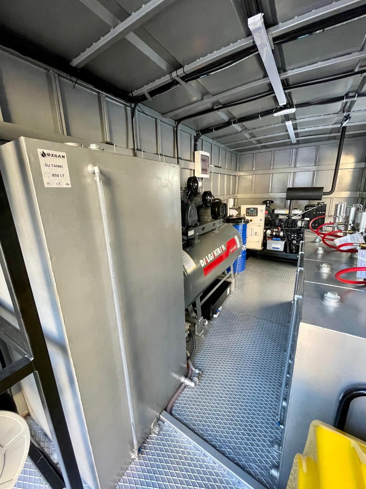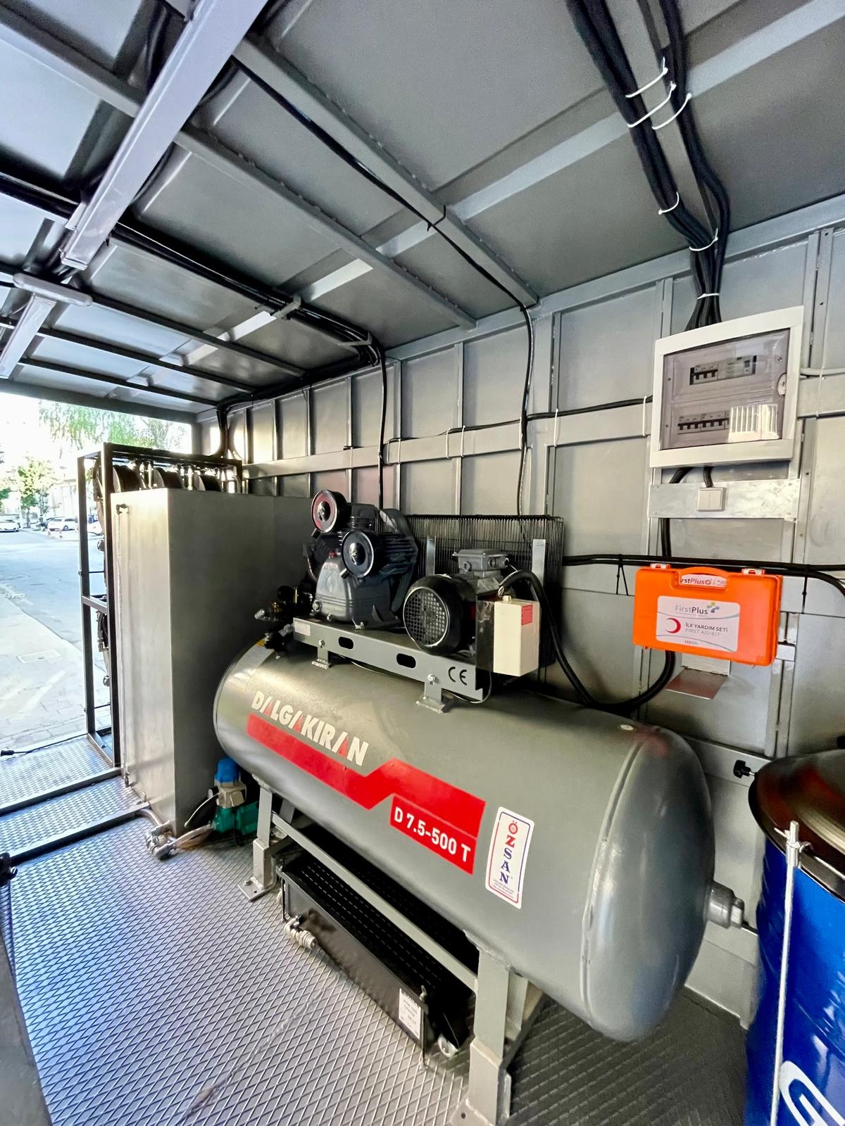 Kısaca içerisindeki ekipmanlar şöyledir; Jeneratör, Kompresör, Yıkama Makinası, Kaynak Makinası, Oksijen Asetilen Tüp Dolabı, Atık Yağ Sistemi, İnce Yağ Sistemi, Gres Sitemi, Hava Sistemi, Su Makarası, Mazot Tankı ve Pompası, Su Tankı, Çalışma Masası, Takım Dolabı, Mengene, Pano, Elektrik Tesisatı, İç ve Dış Aydınlatma vb. dir.